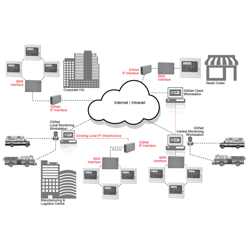 GSNet can monitor an unlimited number of remote sites via IP or GPRS.